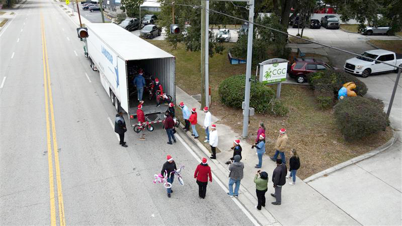 As the holiday season ramps up, so does the community outreach. For the past 35 years, generous employees at Landstar's Jacksonville headquarters have partnered with the Child Guidance Center (CGC), which offers support services to children and families in the area, to provide holiday gifts for at-risk youth. This year, employees donated over 120 new bikes and helmets, which Landstar organizer Sid Sutphin helped deliver in time for the holidays. Employees also collected gifts and monetary donations for the Christmas wish lists of 125 children in need at CGC, thanks in part to Kristin McNaron, who coordinated the effort.